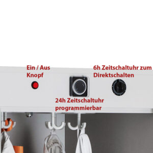 Der Trocknungsschrank ist mit zwei unterschiedlichen Zeitschaltuhren ausgestattet. Eine programmierbare 24h Zeitschaltuhr ermöglicht die Trocknung zu genau definierten Zeitpunkten. Sie lässt sich beispielsweise so einstellen, dass die Arbeitskleidung immer nachts mit dem günstigen Nachtstromtarif getrocknet wird. Die zweite Schaltuhr, eine 6 Stunden Direktschaltuhr, ermöglicht den sofortigen Start der Trocknung mit einer Zeitspanne von bis zu 6 Stunden, ohne dass die mit der anderen Uhr eingestellte Programmierung aufgehoben werden muss. Mit Hilfe eines Ein/Aus Schalters kann der Trockenschrank jederzeit ganz ausgeschalten werden.