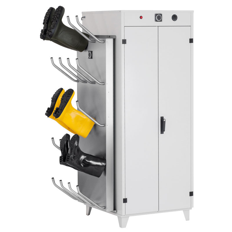 Der Trockenschrank für Kleider und Schuhe ist mit einem seitlich angebrachten Warmluft Schuhtrockner ausgestattet. Dieser bietet Platz für 10 Paar Schuhe, welche durch das einblasen von warmer Luft in das Schuhinnere schnell und schonend getrocknet werden. Der Bekleidungstrockenschrank ist ebenfalls in einer Ausführung für 20 Paar Schuhe erhältlich (siehe Optionen). Hierbei ist auf beiden Schrankseiten jeweils ein Schuhtrockner für 10 Paar angebracht.